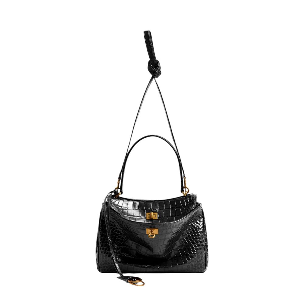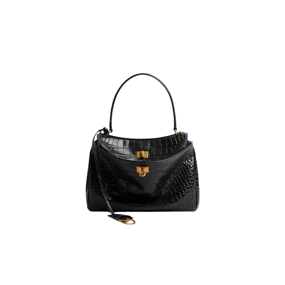 La Rodeo è il nuovo volto dell’eleganza di Balenciaga: una borsa strutturata e raffinata, che evoca un senso di lusso classico con un taglio contemporaneo. La stampa coccodrillo nera conferisce un tocco di esotismo e profondità, mentre le finiture in oro aggiungono un dettaglio luminoso e prezioso, rendendola l’accessorio perfetto per la donna che ama il lusso non convenzionale. ?