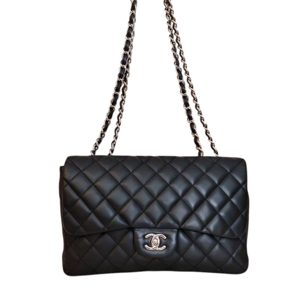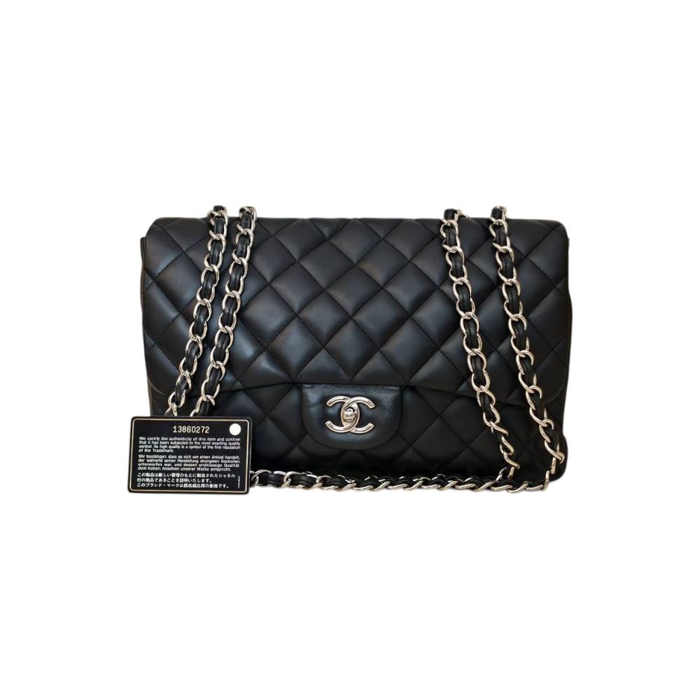 Innalza il tuo guardaroba al livello più alto con la Chanel Timeless Classic Jumbo, la borsa che rappresenta il sogno proibito di ogni collezionista. Realizzata in pregiata pelle nera con un lucente hardware argento, questa creazione è l’emblema dell’eleganza parigina e della maestria artigianale che solo Chanel sa offrire. 💎