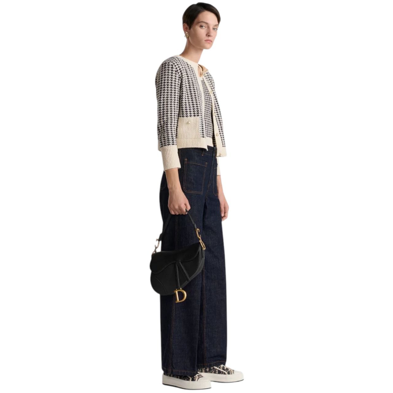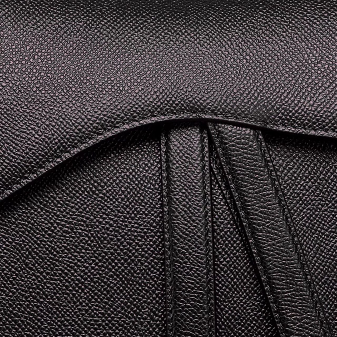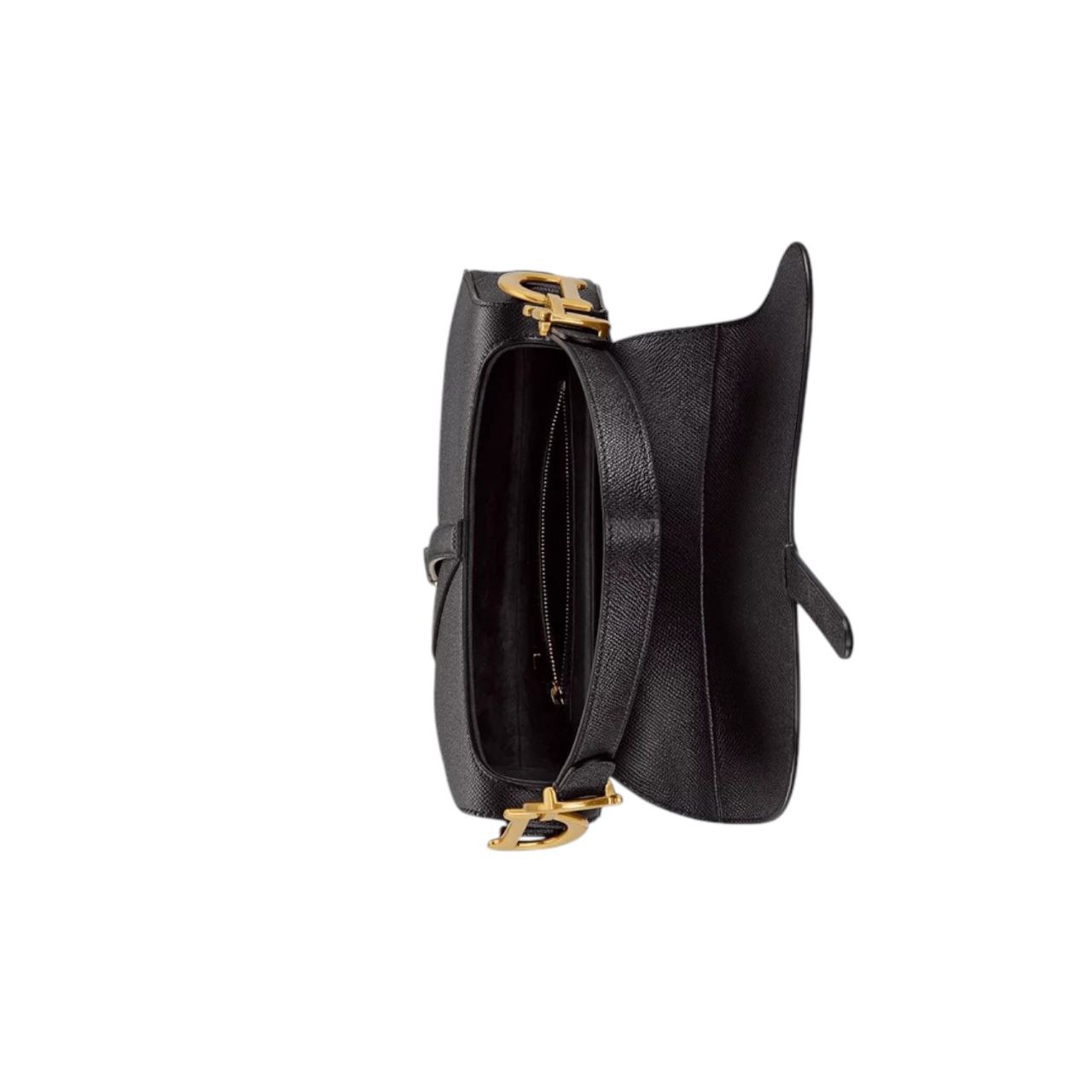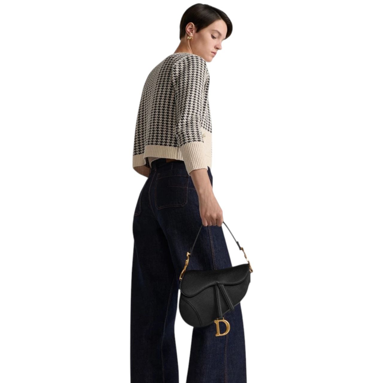 La Dior Saddle non è solo una borsa; è un’opera d’arte. La sua silhouette inconfondibile a forma di sella, il flap asimmetrico e i dettagli metallici con la firma “CD” la rendono immediatamente riconoscibile. In questa versione in pelle nera, il suo fascino è amplificato, rendendola un pezzo estremamente versatile che si adatta a ogni occasione, dal look casual chic a quello più formale.