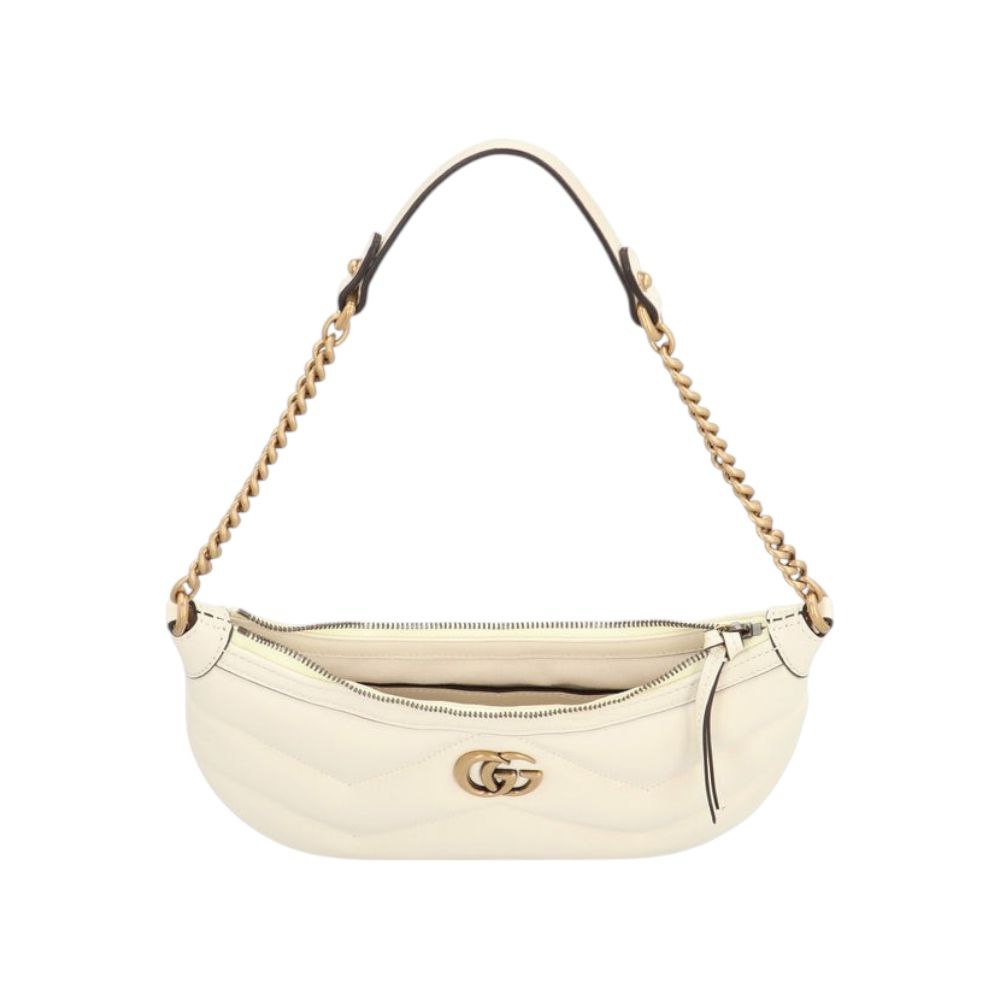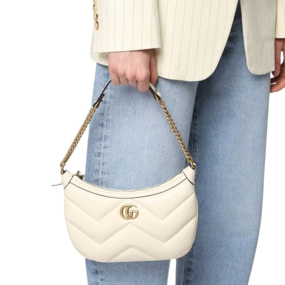 La Marmont è celebre per il suo design chevron matelassé e il distintivo doppio logo G intrecciato, una firma inconfondibile di Gucci. La versione bianca con hardware oro è sinonimo di purezza e opulenza, perfetta per aggiungere un tocco di luce e raffinatezza sia ai look da giorno che a quelli serali.