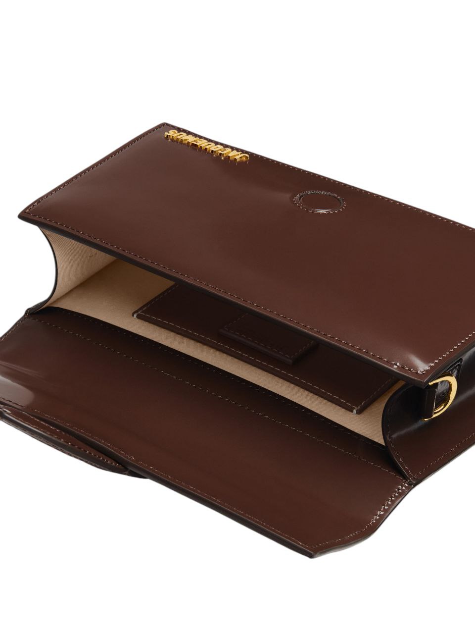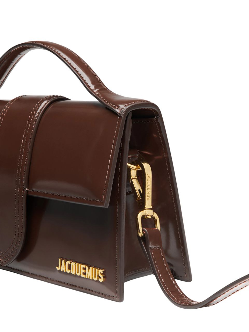 La borsa JACQUEMUS Le Grand Bambino in vernice marrone scuro è un accessorio statement che riflette un gusto sofisticato e una passione per il design all’avanguardia.