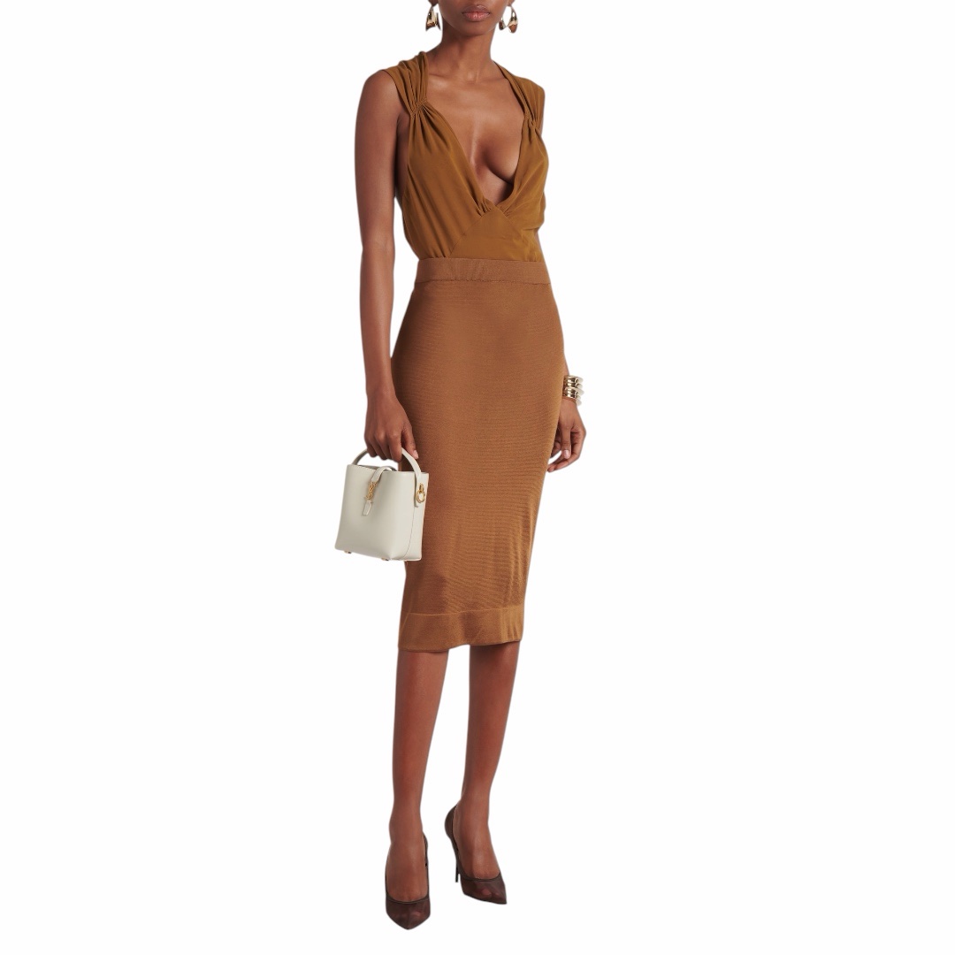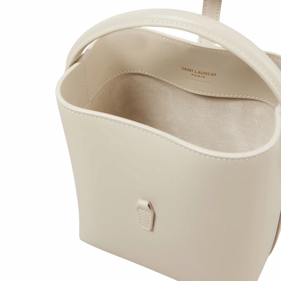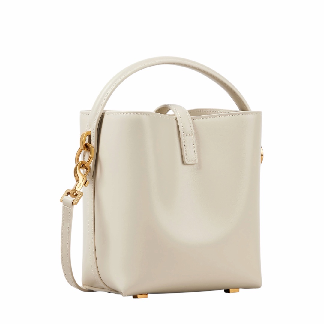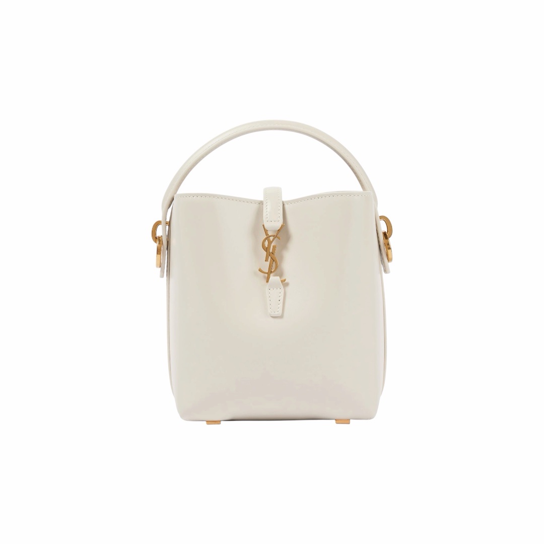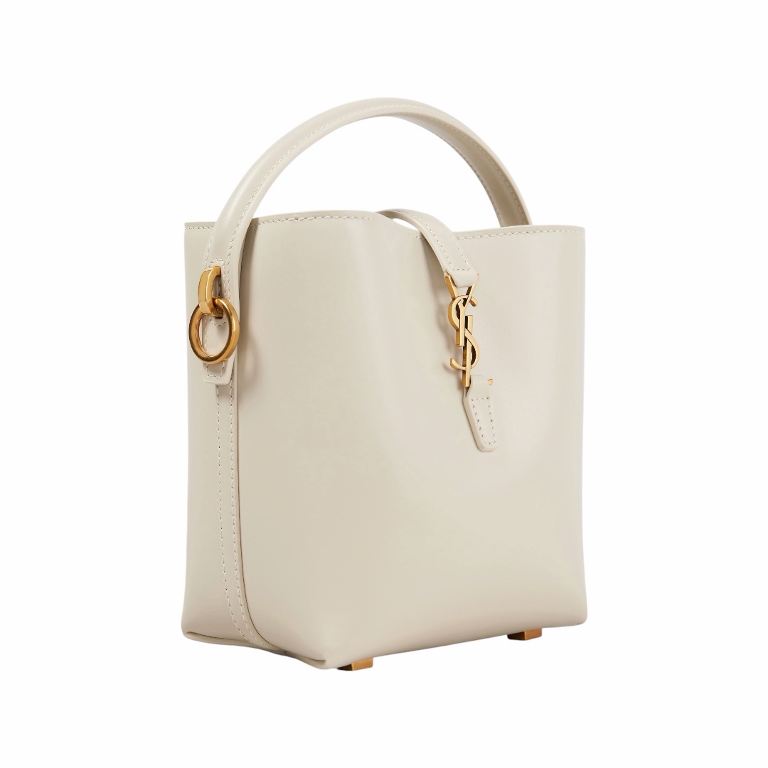 La Le 37 Mini non è solo una borsa, è un vero e proprio gioiello di pelletteria. La sua struttura a secchiello reinterpretata in chiave mini offre un’estetica fresca e di tendenza, mentre il contrasto tra il bianco candido della pelle e la lucentezza dell’hardware dorato (incluso il celebre monogramma YSL) crea un impatto visivo di pura classe.